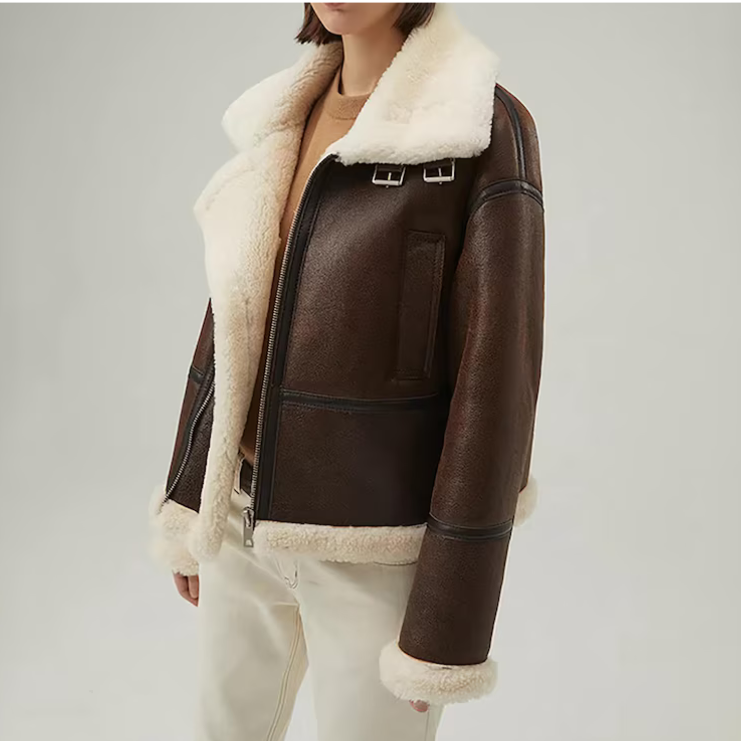 Thick shearling collar with adjustable buckle straps for added wind protection
